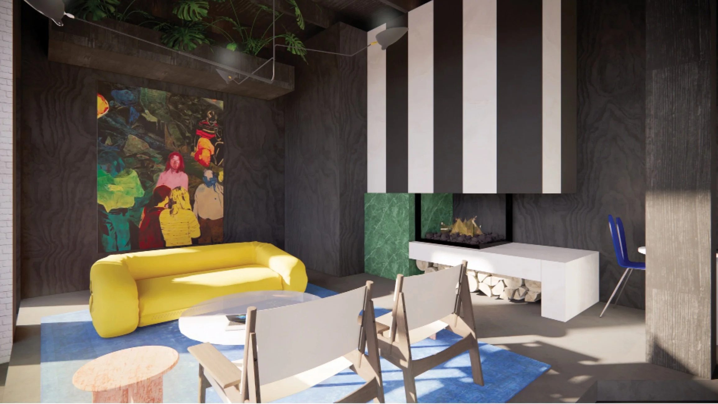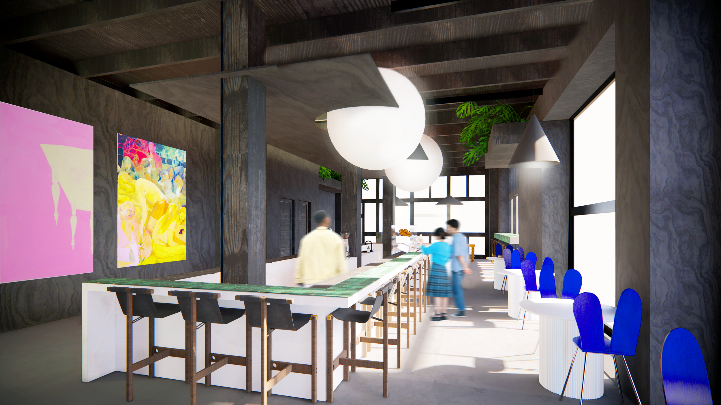 Colectivo is built on personal touches and good coffee. What makes their brand unique is the attention to detail in their spaces. In each location customers are surrounded by monsteras, antique fixtures, and rustic touches. The Colectivo redesign embraces those elements in a new way. Seating throughout the space use wood that almost resembles drift wood similarly to materials in existing shops. Pops of color are placed to emphasize graphic choices the brand consistently presents in their advertising. Monsteras are placed in charred wood planter boxes to match materiality throughout the space.